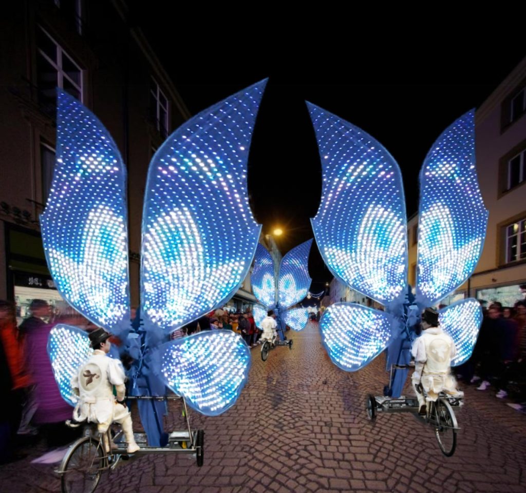 “When the bicycles come to a stop, an impressive dance act begins, featuring breathtaking costumes and props. Bike Parade is a fairy tale, a dream that unfolds as the parade progresses. This performance can be staged in daylight, but is also wonderfully beautiful with lighting at twilight.“